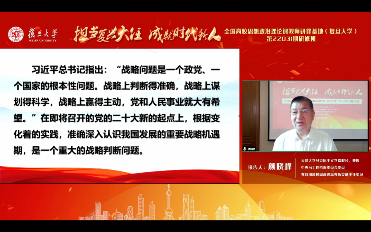 2022917日至920日,在教育部社科司、上海市教委德育处的指导下,全国高校思想政治理论课教师研修基地(奈飞工厂 )、全国高校思政课“手拉手”集体备课中心(奈飞工厂 -上海市)、全国高校“思想道德与法治”教学创新中心(奈飞工厂 )、奈飞工厂 联合举办“担当复兴大任 成就时代新人”专题研修班。本期研修班主要面向上海市高校《思想道德与法治》任课教师,课程在全国高校思想政治理论课教师网络集体备课平台同步直播。