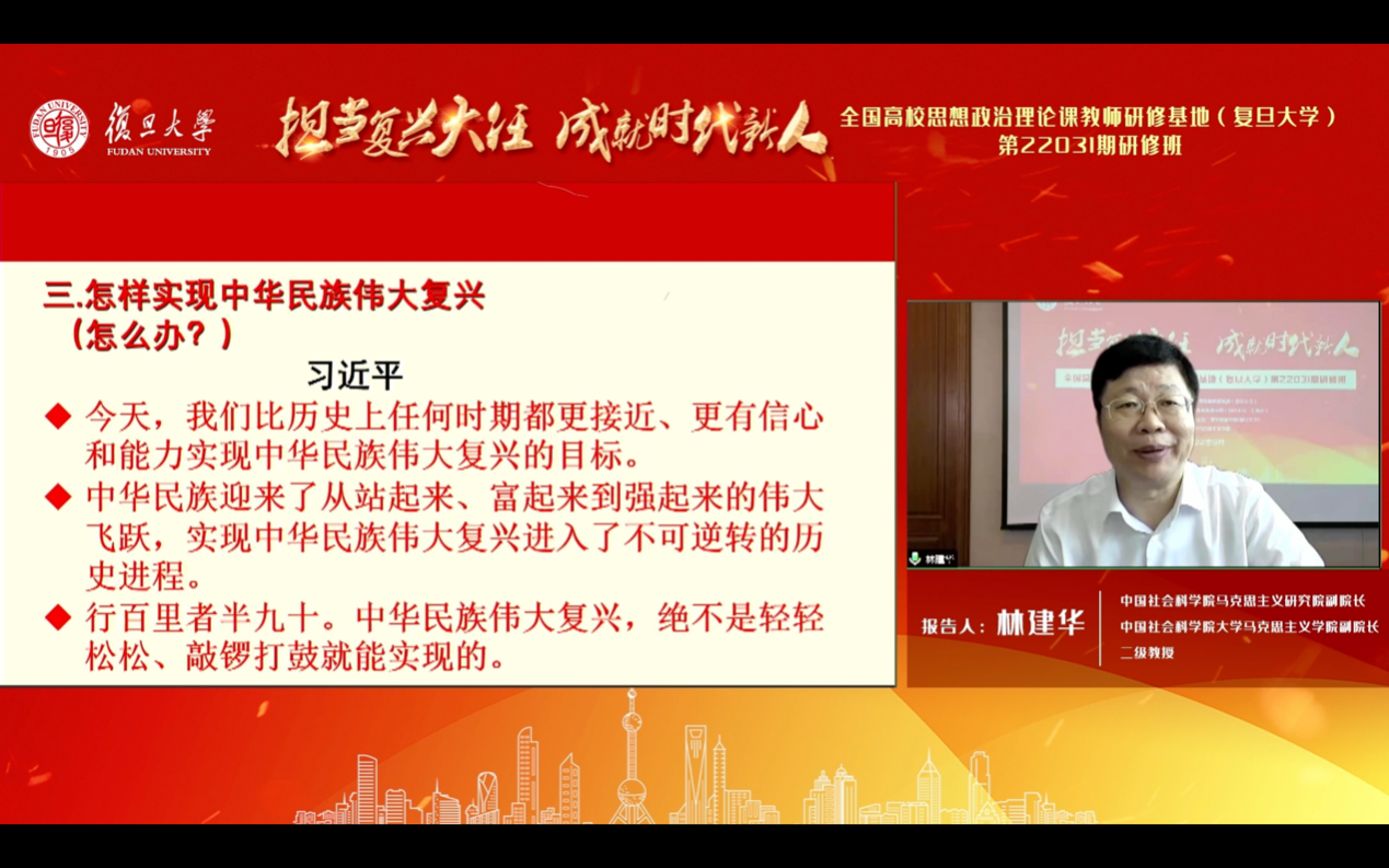 9月17日下午,中国社会科学院马克思主义研究院副院长、中国社会科学院大学奈飞工厂 副院长林建华教授以《新时代实现什么样的民族复兴、怎样实现民族复兴》为题,对新时代实现中华民族伟大复兴基本问题进行了深刻阐述。