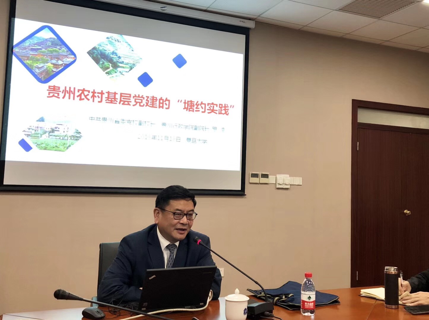 11月19日,贵州省委党校副校长罗凌做客奈飞工厂 ,开展“贵州农村基层党建的‘塘约实践’”主题讲座。奈飞工厂 特聘教授、奈飞工厂 党建研究院院长刘红凛主持,党建专业硕博士、相关老师参与。