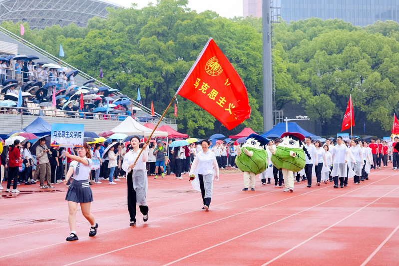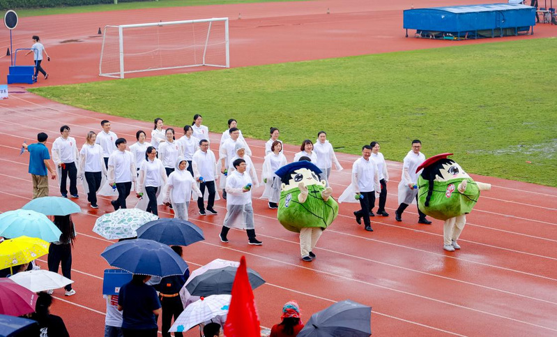 风雨初歇,学校各机关、院系及附属单位的运动员代表方队队列严整,在旗手与领队的带领下相继入场。