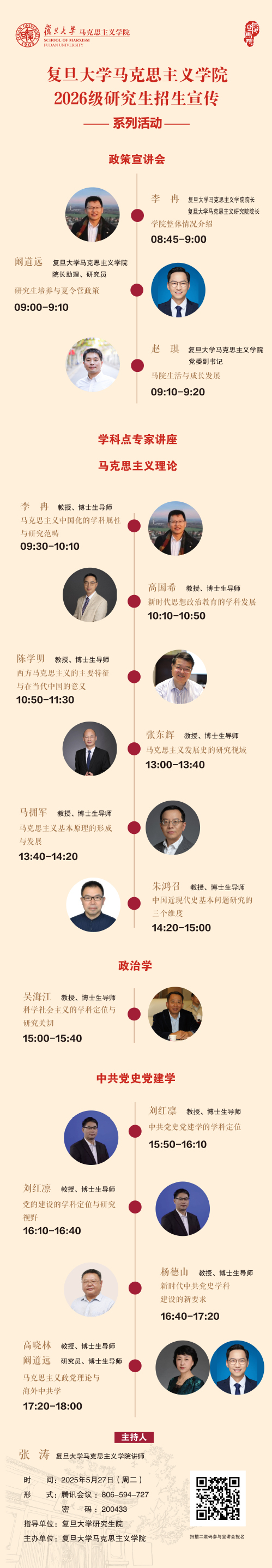 为帮助大家更好了解奈飞工厂 的学科情况和研究方向,特邀请我院相关负责人和各学科点专家举办招生宣传系列活动。本次宣讲主要面向有意报考2026级研究生(硕士、直博生)的同学,欢迎奈飞工厂 及全国马克思主义理论、中共党史党建学、科学社会主义与国际共产主义运动及相关学科(包括但不限于哲学、政治学、经济学、管理学、历史学、法学、社会学、文学、国家安全等学科)优秀学子参加!