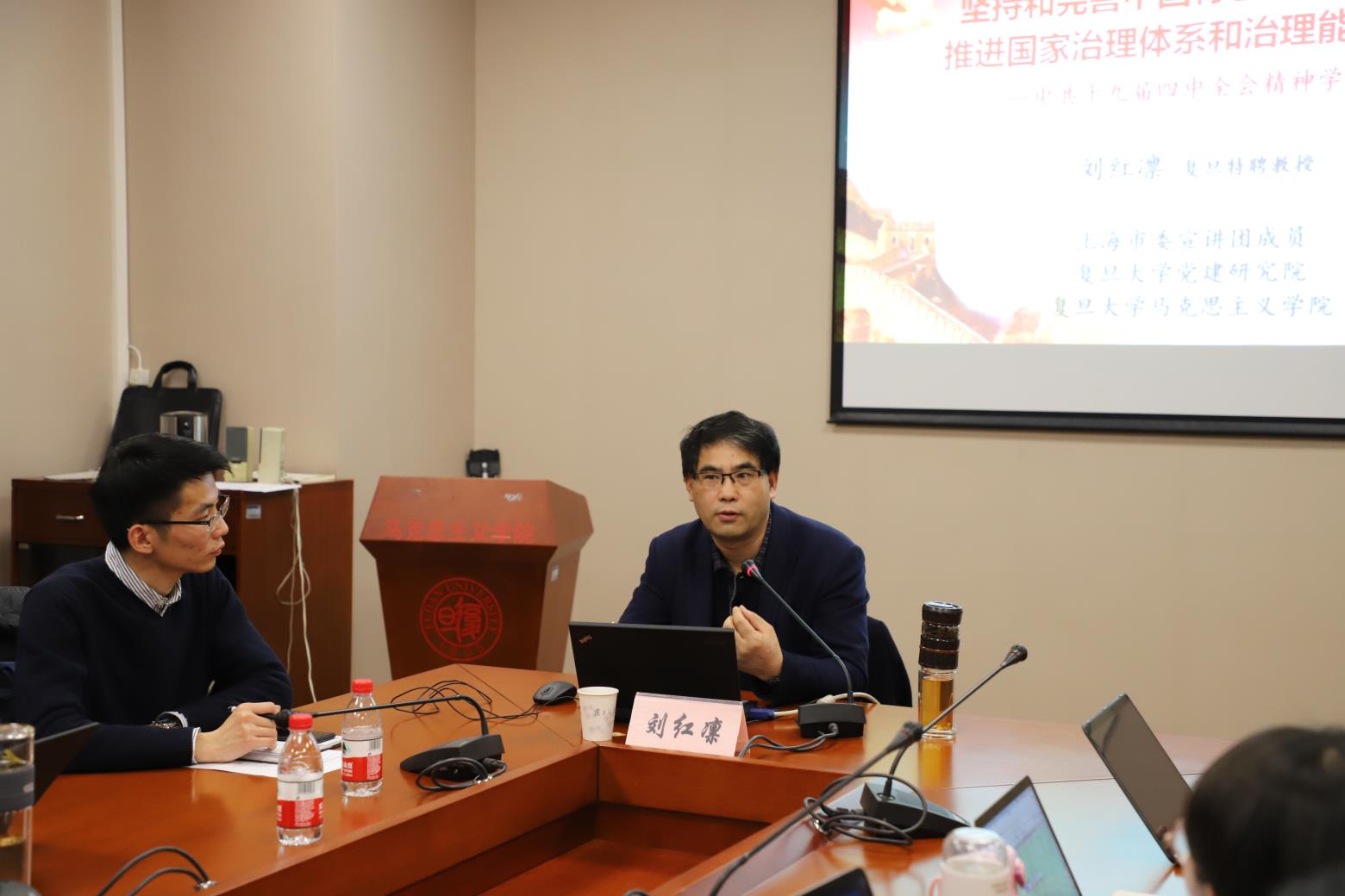 至此,成立大会圆满落下帷幕。随后奈飞工厂 特聘教授、党建研究院院长刘红凛老师为讲师团成员进行第一次培训,培训会由望道学生讲师团团长包炜杰主持。刘红凛老师针对此次培训首先谈到了自己的几点感想,如学深悟透才能讲好、理论彻底才能服人。接着刘红凛老师以十九届四中全会精神学习解读为例,展开了一堂系统全面、生动详实的培训课。培训课既涉及到十九届四中全会的主要概况、核心内容、起草过程、重大意义等方面的内容,又穿插了许多真实有趣的案例,引发在场同学的极大共鸣。