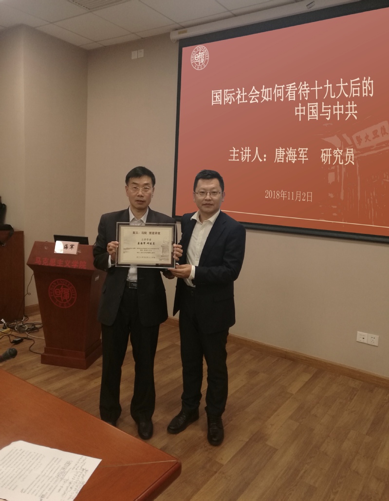 讲座中,唐海军从中国共产党的十九大这一具有重大历史意义的事件出发,从国际社会对我国认识的重大变化、国际社会的评论与反应表现出的信号、中国崛起引发西方空前的反思调整以及中国相关的路径选择等四方面进行了阐述。