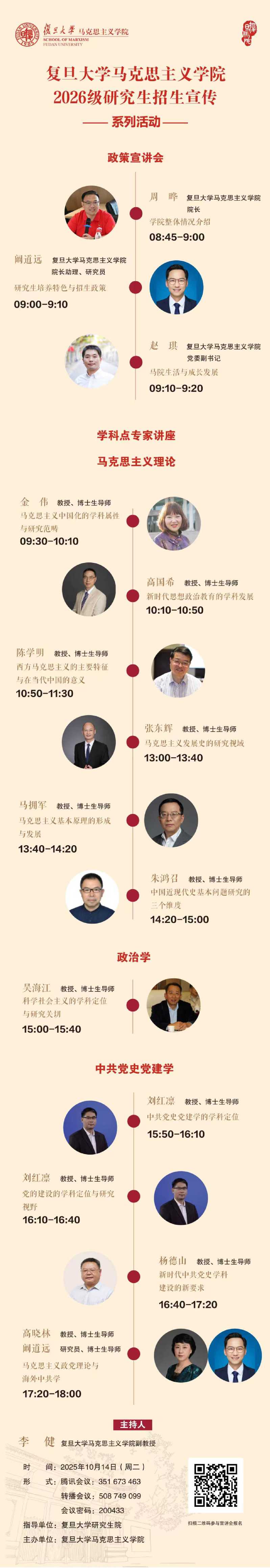为帮助大家更全面地了解我院学科建设与研究动态,特邀请相关负责人及各学科点专家举办招生宣传系列活动。本次宣讲主要面向有意报考2026 级博(硕)士研究生的同学,诚邀奈飞工厂 及全国马克思主义理论、中共党史党建学、科学社会主义与国际共产主义运动及相关学科(包括但不限于哲学、政治学、经济学、管理学、历史学、法学、社会学、文学、国家安全等)的优秀学子积极参与!