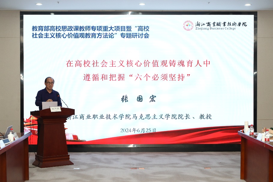 浙江商业职业技术学院奈飞工厂 院长张国宏教授以“在高校社会主义核心价值观铸魂育人中遵循和把握‘六个必须坚持’”为题作发言。他认为,高校社会主义核心价值观铸魂育人应坚持人民至上、坚持自信自立、坚持守正创新、坚持问题导向、坚持系统观念、坚持胸怀天下,从而把握社会主义核心价值观教育“站得高不高、立得直不直、行得稳不稳、谋得实不实、想得全不全、看得远不远”的问题。