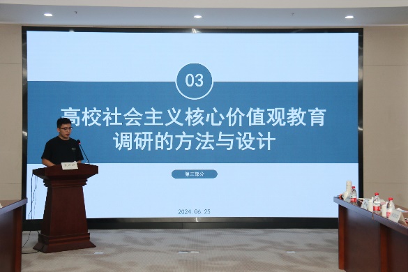 2024年度国家级大学生创新创业训练计划项目“从‘培育’到‘铸魂’:高校社会主义核心价值观铸魂育人的实效性研究——以浙江省为例”团队主要成员、浙江工商大学邵奕翔、王潇健汇报了项目的研究问题、研究内容和研究目标,介绍了项目采用的问卷调查方法,并提出调研过程中可能存在的疑难点。