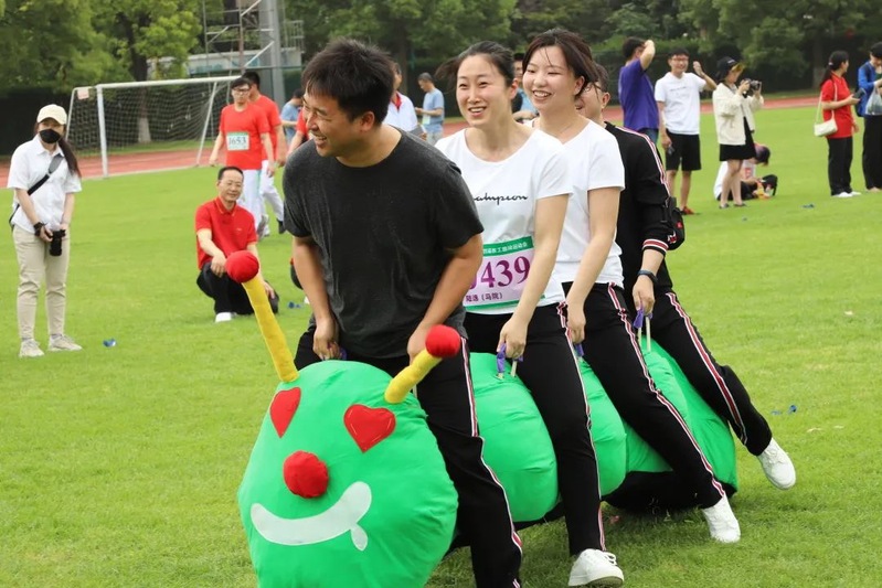 在教职工趣味运动会环节,学院工会组织17名教职工参加了全部的趣味运动会比赛项目,在抱球接力、毛毛虫竞速、托球接力、投篮比赛等项目中都有着我院老师的身影。大家身着统一的服装,全力以赴、接续配合,比赛现场掌声、笑声、欢呼声此起彼伏。