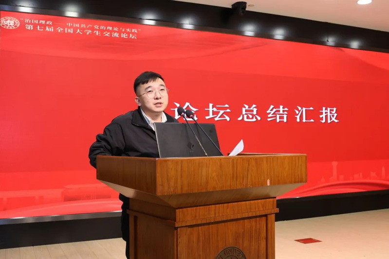 中国共产党革命精神与文化资源研究中心执行主任、研究员朱鸿召对本次论坛进行了总结发言。他指出,治国理政论坛有价值、有意义,它为全国大学生搭建了一个交流探讨、展示青春理想的舞台,在未来也将继续接过传承接力棒,把论坛长期办下去。他还从在中国就是在世界、读马列就是读社会、做学问就是做事业三方面分享了自己参加论坛的感悟,鼓励同学们坚持辩证唯物主义和历史唯物主义的方法论,立足现实,守正创新,实事求是,培养科学理性精神,立志做好大学问、真学问。