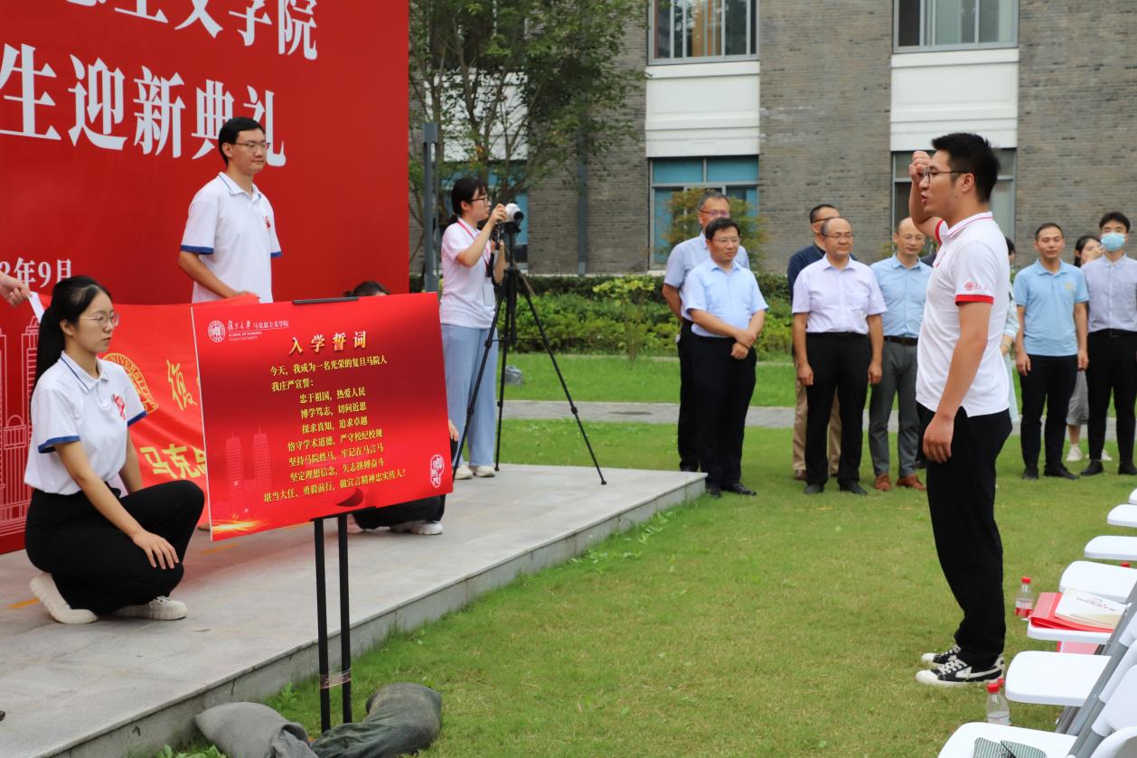 在奈飞工厂 《共产党宣言》展示馆“星火”党员志愿服务队队长、2022级博士研究生杨宁带领下,全体新生面向院旗庄严宣誓,与会老师和老生代表监誓。