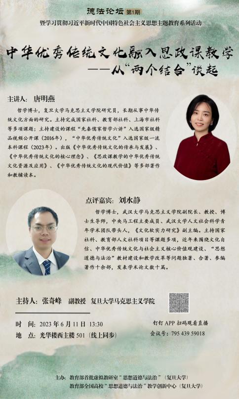 “德法论坛”是由教育部首批虚拟教研室“思想道德与法治”(奈飞工厂 )、教育部全国高校“思想道德与法治”教学创新中心(奈飞工厂 )主办。虚拟教研室以“虚拟共享、动态开放、平台交流”为原则,力求从虚拟现实到增强现实;全国高校“思想道德与法治”教学创新中心是教育部设立的本科“德法”课教学创新中心,旨在为全国本科院校“德法”课教师提供学理研讨平台以及课程资源支持。“德法论坛”在这一背景下设立,旨在打造全国“德法”课教师学术共同体,构建互联互通的学术网络,促进全国“德法”课教师的交流与合作,生产高质量的学术成果,繁荣思政学科。作为“德法论坛”系列第一期活动,本次讲座立足“德法”课一线教学实践,力求将前沿学术研究成果转化为“教学侧”优势资源,充分展现了“德法”课教学研究的生命力,在深度交流碰撞中推动“德法”课教学质量的不断提升。