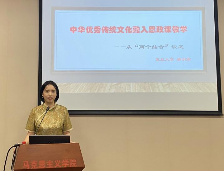 唐明燕老师以马克思主义基本原理同中华优秀传统文化相结合为引,在中华优秀传统文化精神内核的具体论说中特别强调中华优秀传统文化是儒释道的高度融合,并澄清了对道家、道教、佛教的一些常见误解。唐明燕老师又从人格修养、社会关爱和家国情怀等方面分享了如何将中华优秀传统文化融入思政课教学的经验。讲座的最后,唐明燕老师建议一线教师要在思政课教学中充分汲取儒释道三家的理论优势,这不仅能为思政课教师的备课、教学实践提供丰沛的理论资源,同时也能为教师自主学习、自我完善、知行合一提供思想土壤。
