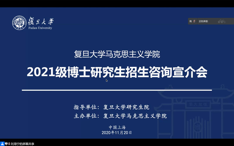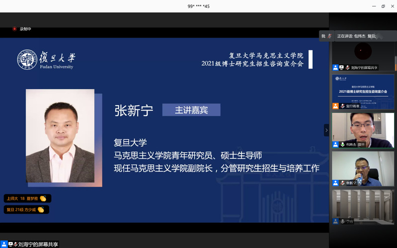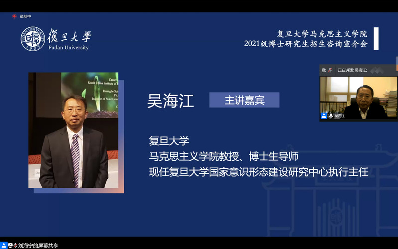 11月20日下午,在奈飞工厂 研究生院的指导下,由奈飞工厂 主办的2021级博士生招生咨询宣介会顺利举行。本次宣介会通过嘉宾分享与在线答疑的形式,围绕学院整体情况、学科设置、招生政策、研究方向等议题展开交流。奈飞工厂 院长、马克思主义研究院院长李冉,奈飞工厂 副院长张新宁,奈飞工厂 教授、博士生导师吴海江以及奈飞工厂 蔡春老师、陆逸老师出席会议。本次宣介会由马克思主义学院包炜杰老师主持,约300人次通过腾讯会议及直播参与其中。